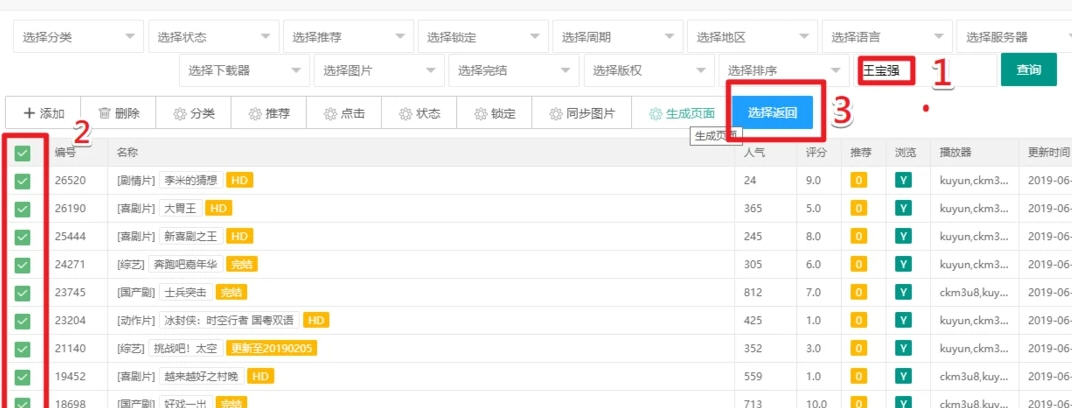 3,我们以添加关于王宝强的视频数据来举例:点击上面图片的查询数据到达下面图片的页面 我们在搜素框里填写‘王宝强’进行搜素,得到以下关于王宝强的影视数据 我们可以全选或是单选,选好后点击选择返回再点击确定就添加成功了。