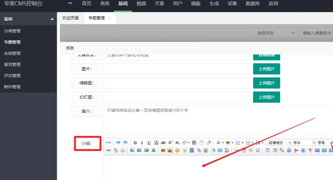 4,最后就是填写专题的介绍。可以先随便填写一段内容 前台看看效果 然后根据自己的效果需要详细填写即可。大功告成。