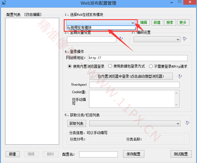 我们选择好了之后下面分类信心,自动填写,不用管、给配置输入个名字,我就用“测试”了、都输入好了,点“保存配置”、软件会自动弹出保存成功、在旁边的“配置列表”就能看得到我们刚保存的配置、然后点右上角的“X”关闭这个页面、到此为止“Web 发布配置管理”我们就弄好了,接下来就是采集发布了。