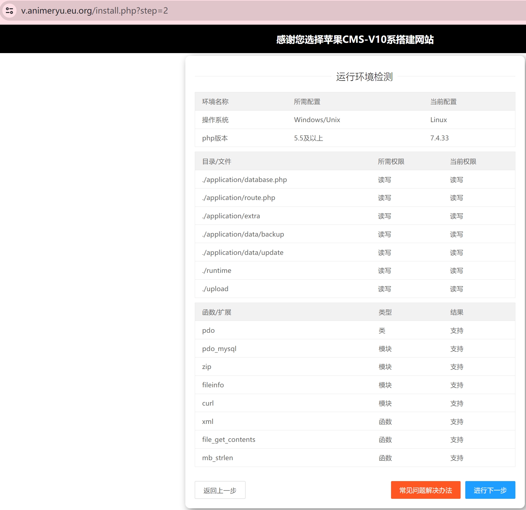4、输入域名/install.php,进入苹果cms安装页面,点击同意协议并安装系统,进入运行环境检测页面,若有权限或扩展缺失(对应条目显示红色),返回aaPanel设置、安装即可,进入下一步安装