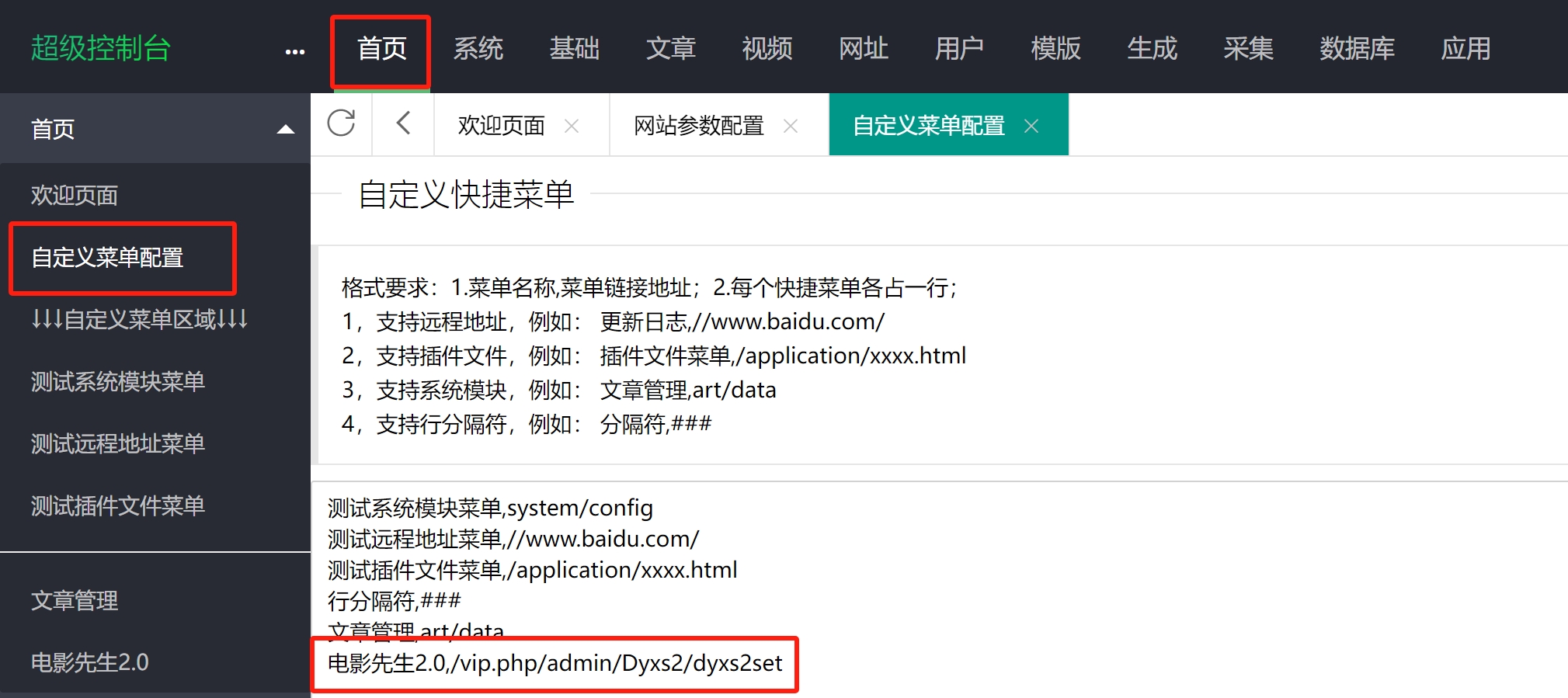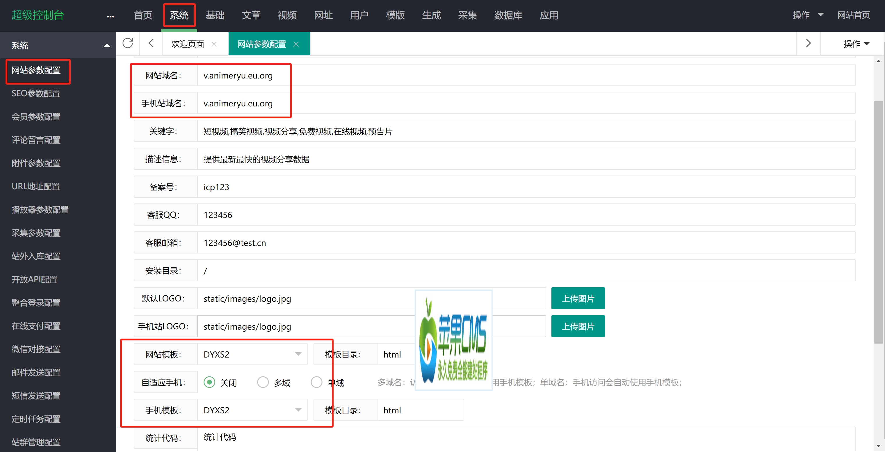 8、苹果cms网站设置。进入系统——网站参数设置,设置域名,选择网站/手机模板为DYXS2,保存。进入首页——自定义菜单配置,添加电影先生2.0,/vip.php/admin/Dyxs2/dyxs2set,保存即可。