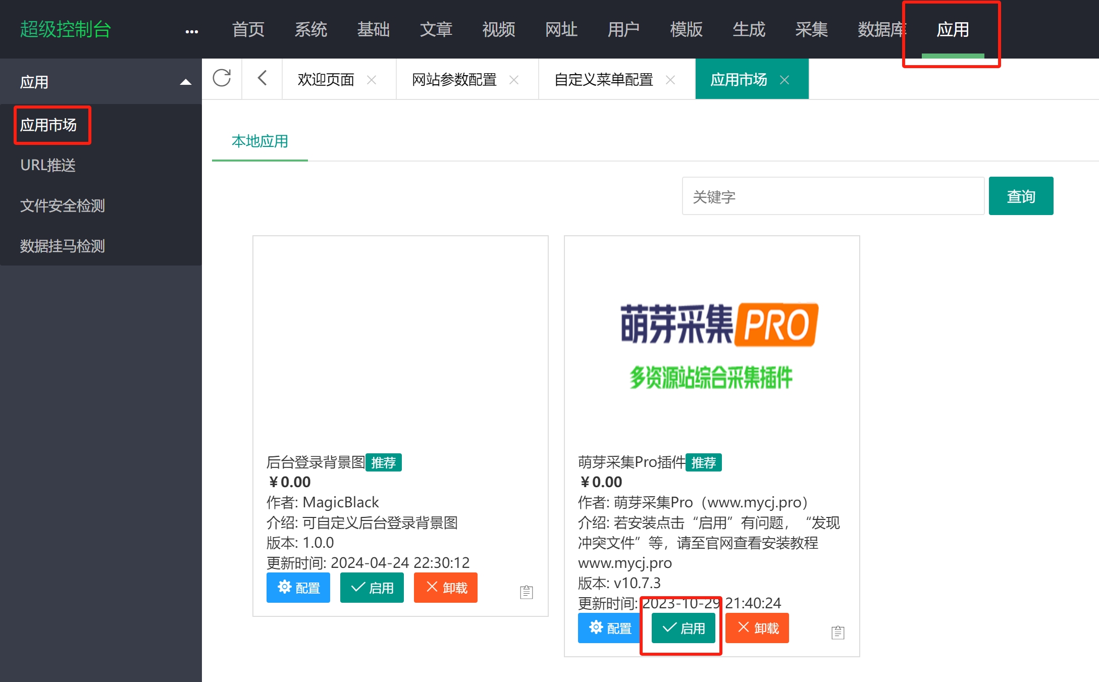 1、上传萌芽采集插件压缩包至网站根目录,解压并赋予777权限。进入网站,点击应用——应用市场,找到萌芽插件点击启用,刷新后可在首页左下角找到萌芽采集资源