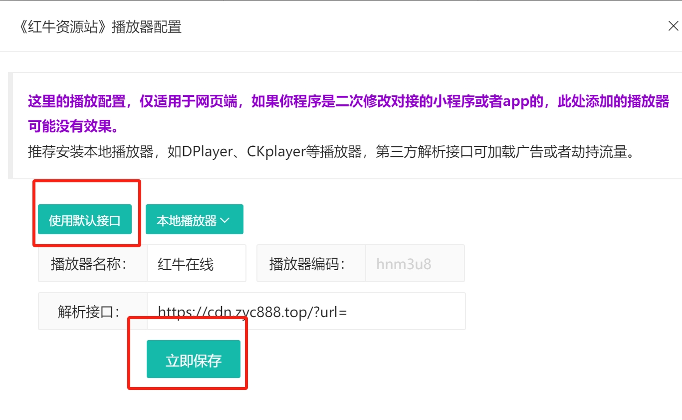 (2)点击播放配置,此处选择默认接口保存即可,超级播放器搭建配置后续更新。
