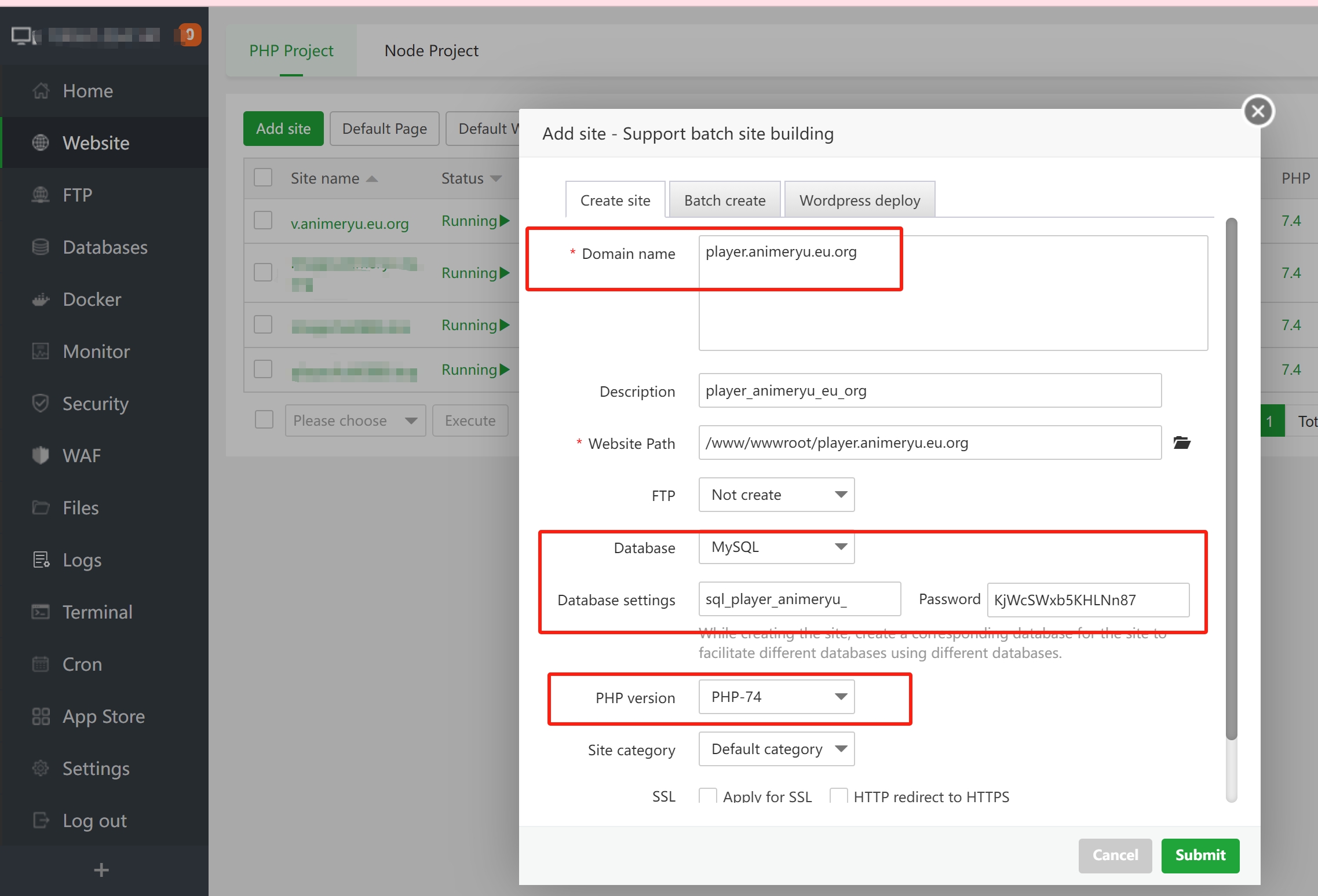 1、新建超级播放器网站,php7.4版本,创建数据库