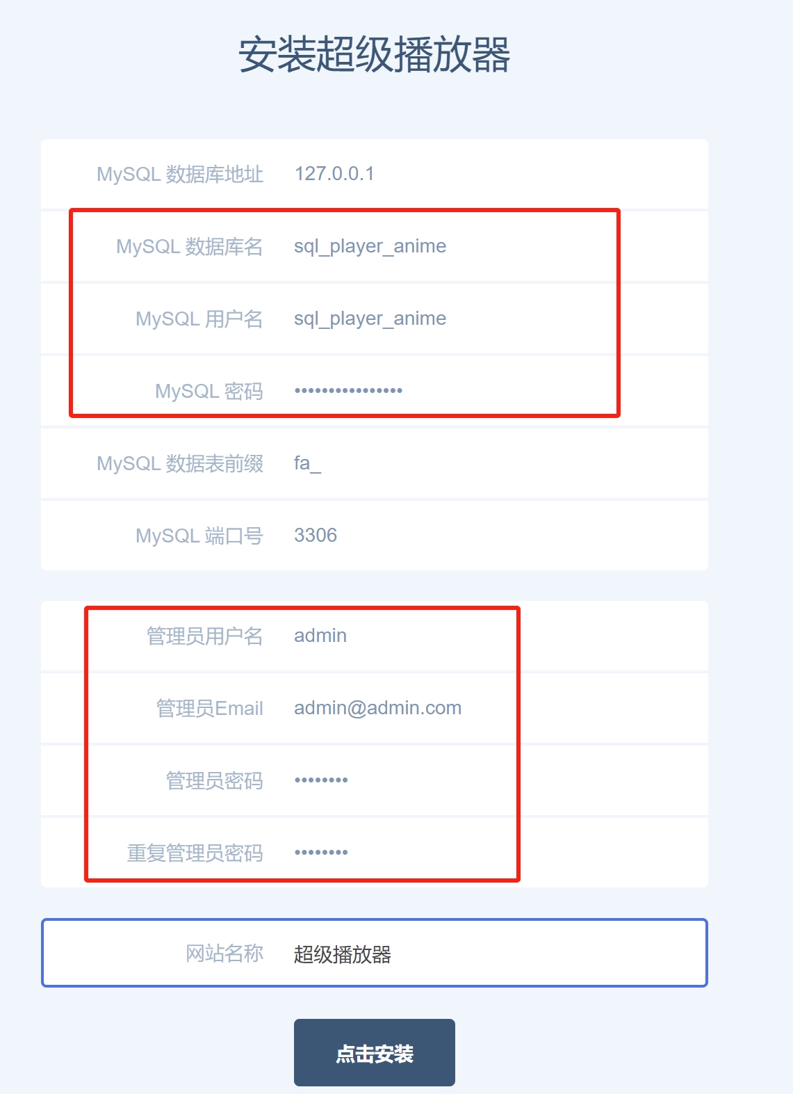 5、访问域名进行安装,安装成功后保存后台入口链接,进入后台设置播放器,此时即可使用,更多个性化设置请自行摸索