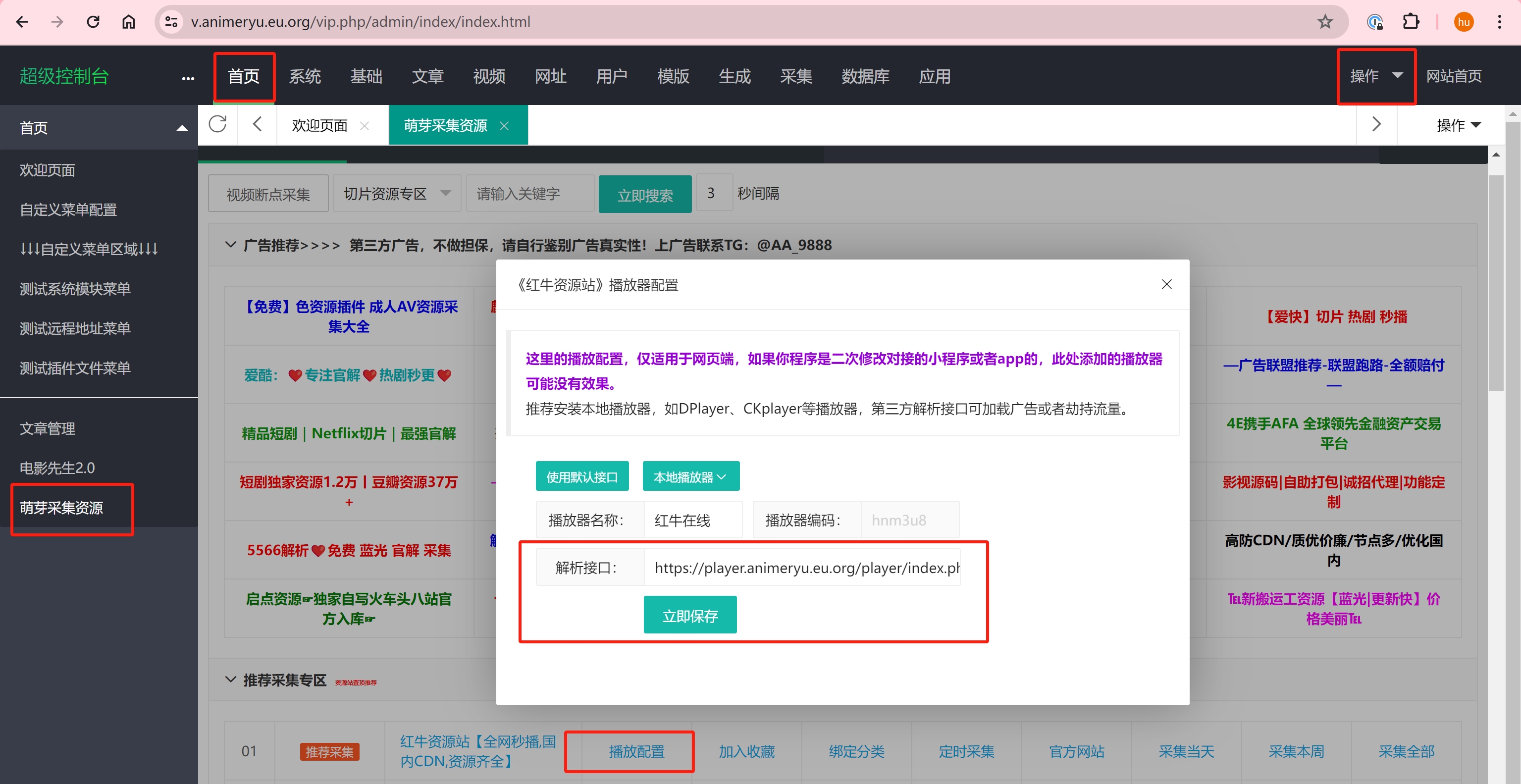 6、前往苹果cms网站后台设置播放器,首页——萌芽采集资源——播放器配置,解析接口配置为https://域名/player/index.php?code=qw&if=1&url= ,保存后点击右上角操作——清除缓存,进入影视站播放即可启用超级播放器。其中code=qw替换为自己的播放器编码,可在超级播放器管理后台播放器列表查看。