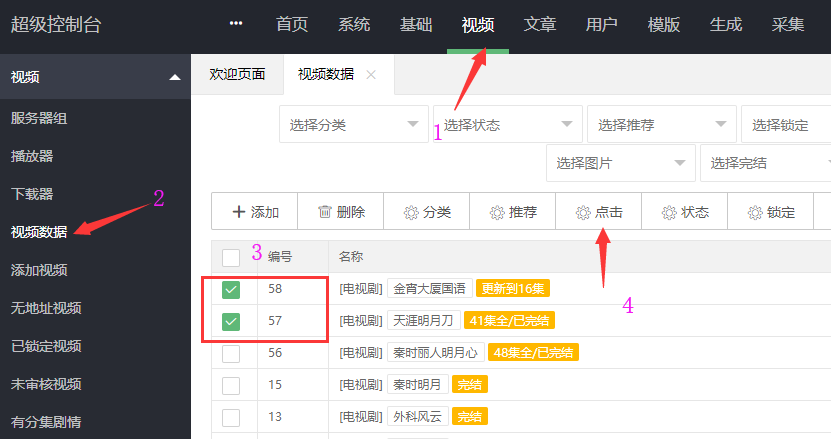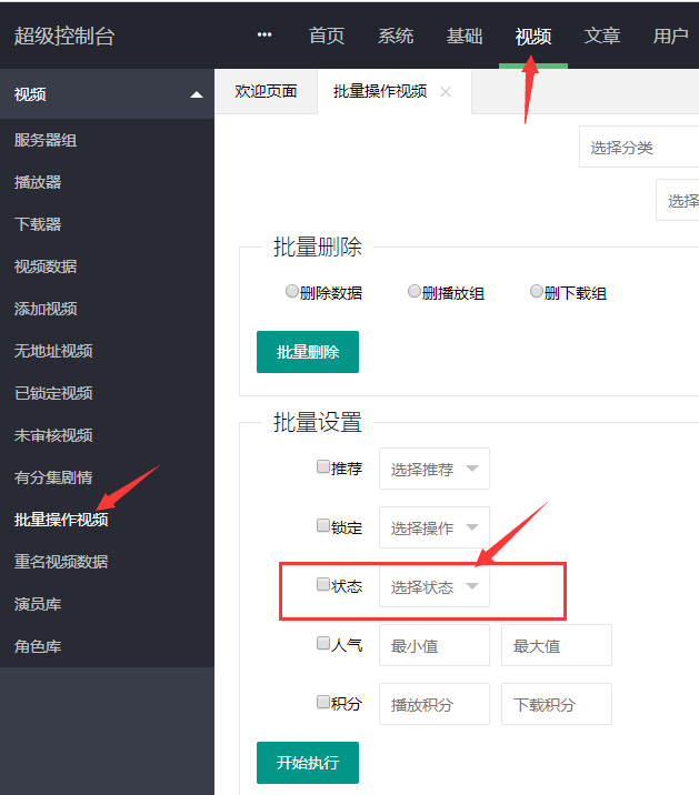 勾选状态,选择状态,然后执行(这里是批量修改设置,也就是说,将所有视频,批量设置未审核,或者批量设置已审核)