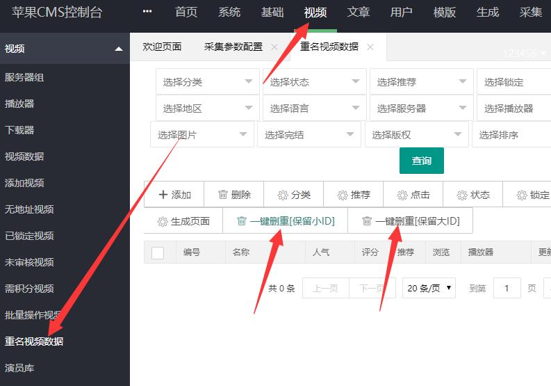 后台“视频”->“重名视频数据”然后选择“一键删重”,保留大ID或者小ID都可以,删除其他一个