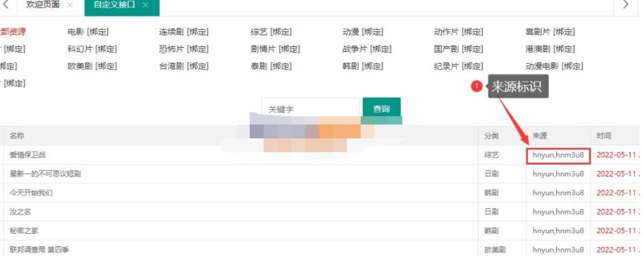 2、进入后,每条数据后面会有一个来源标识,如下图中所示,这里有两个标识,分别为hnyun和hnm3u8,记住这两个标识