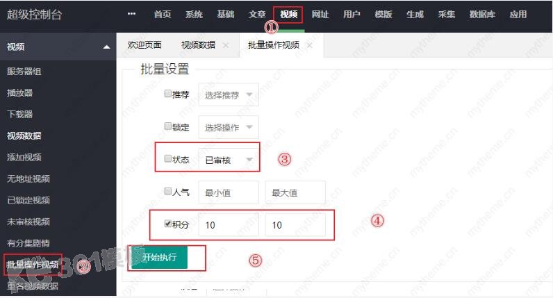 4,上面设置的只是苹果cms单部影片积分播放的操作步骤,如果是要设置苹果cms全站积分播放的话,上面的操作步骤就不灵了,需要用到下面的苹果cms批量操作设置积分播放的步骤。按照图中所示的1-5个步骤最后保存就可以了。