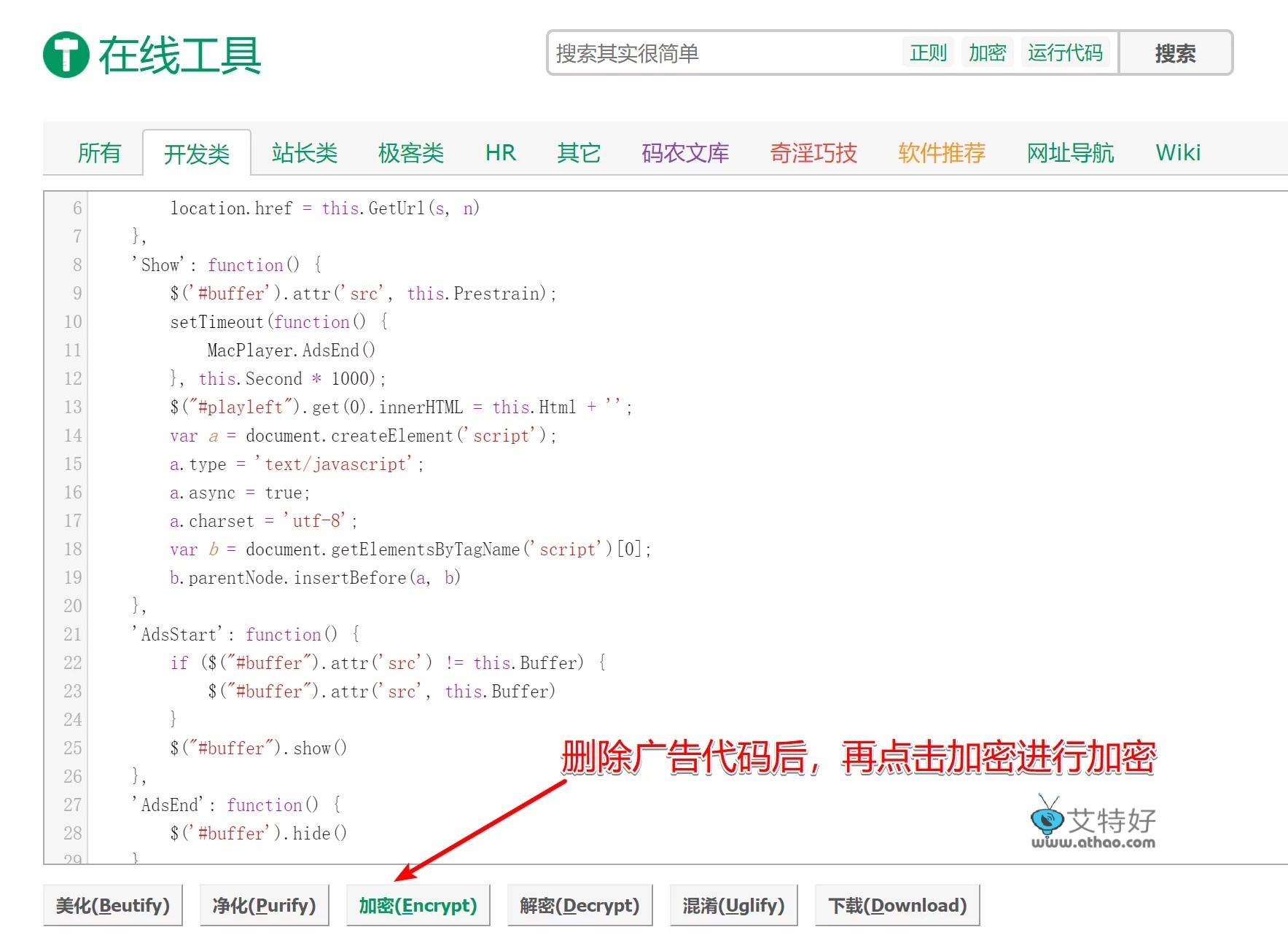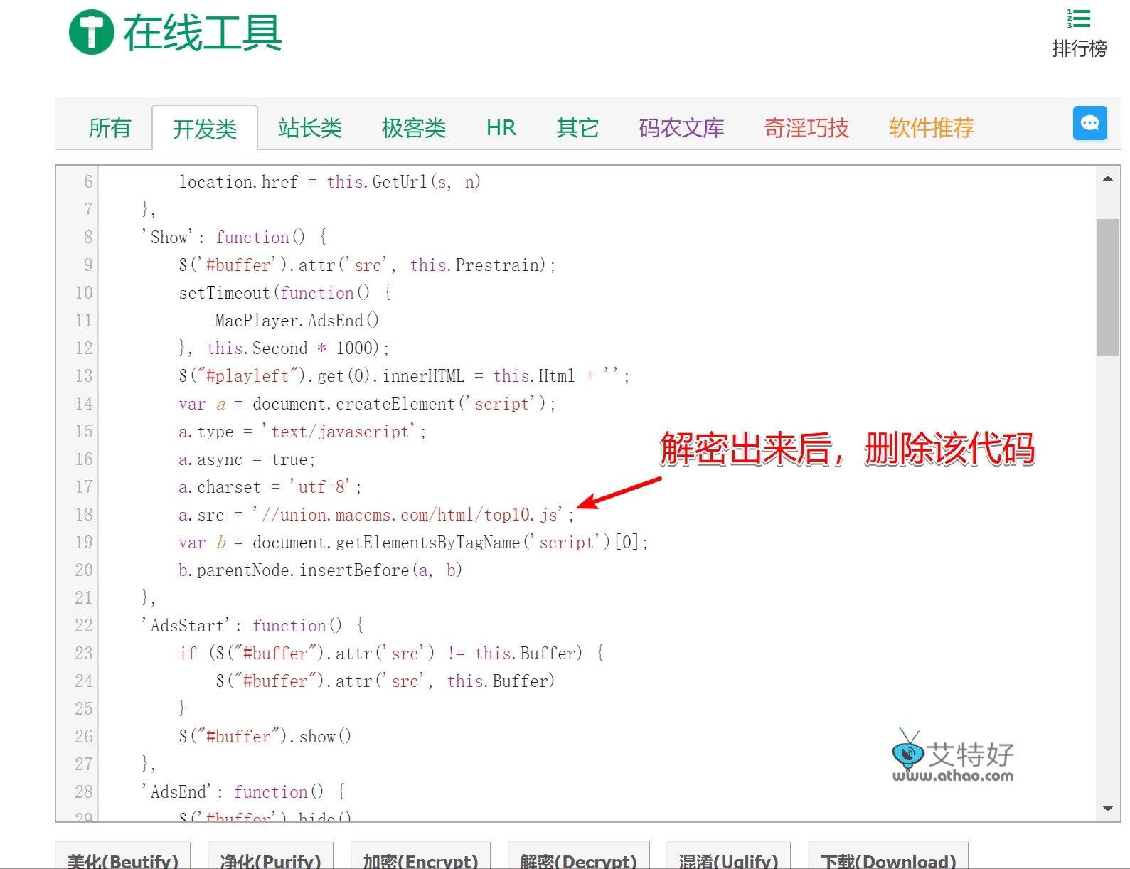 3. 解密出来后,找到该出广告代码,并删除该行代码