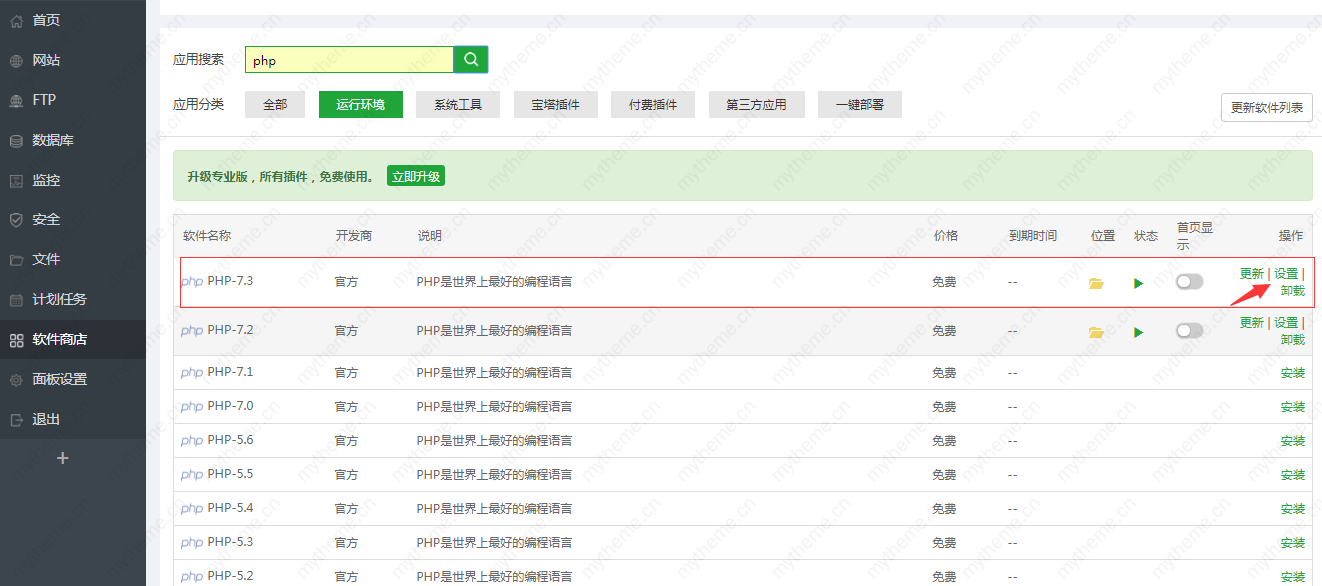 2,然后再找到你的网站环境所使用的php版本点击设置。