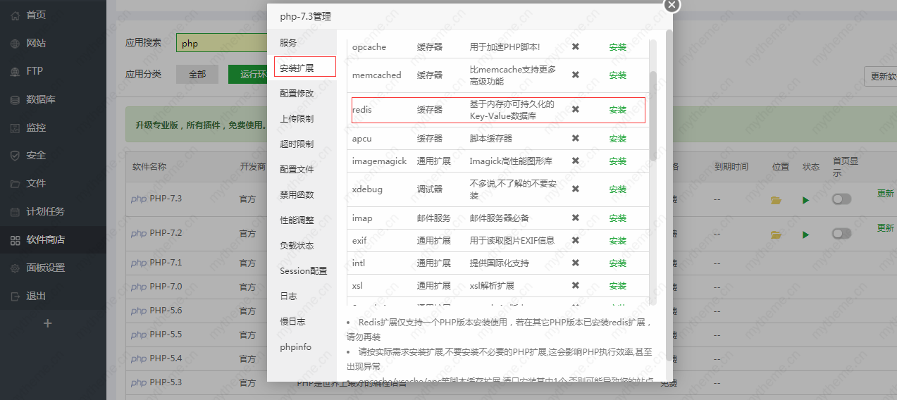 3,进入你所使用的php版本设置,安装扩展,安装redis缓存器