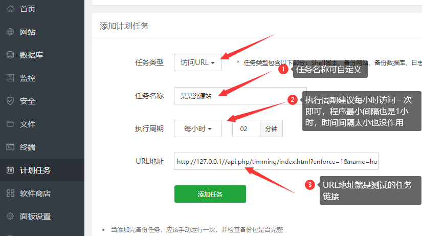 打开宝塔面板上的“计划任务”,任务类型选择“访问URL”,任务名称自定义,执行周期,选择每小时,自定义某个分钟执行,URL填写任务链接