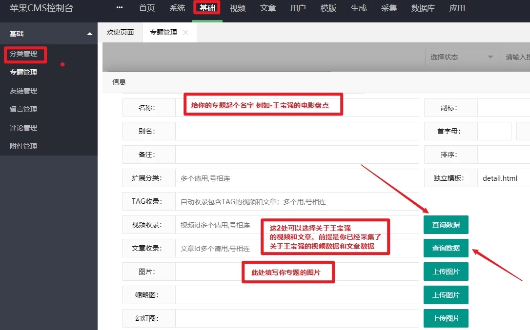 1,进入苹果cms后台按顺序点击 基础>>>专题管理>>>添加