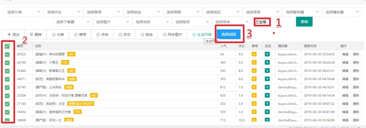 3,我们以添加关于王宝强的视频数据来举例:点击上面图片的查询数据到达下面图片的页面 我们在搜素框里填写‘王宝强’进行搜素,得到以下关于王宝强的影视数据 我们可以全选或是单选,选好后点击选择返回再点击确定就添加成功了。