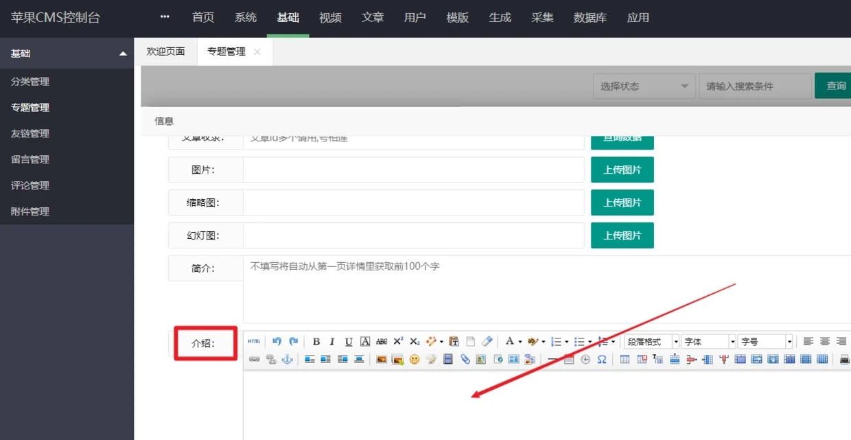 4,最后就是填写专题的介绍。可以先随便填写一段内容 前台看看效果 然后根据自己的效果需要详细填写即可。大功告成。