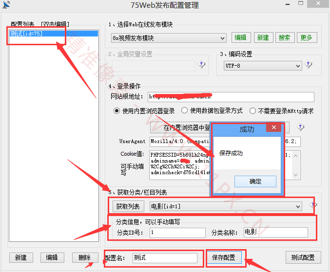 我们选择好了之后下面分类信心,自动填写,不用管、给配置输入个名字,我就用“测试”了、都输入好了,点“保存配置”、软件会自动弹出保存成功、在旁边的“配置列表”就能看得到我们刚保存的配置、然后点右上角的“X”关闭这个页面、到此为止“Web 发布配置管理”我们就弄好了,接下来就是采集发布了。