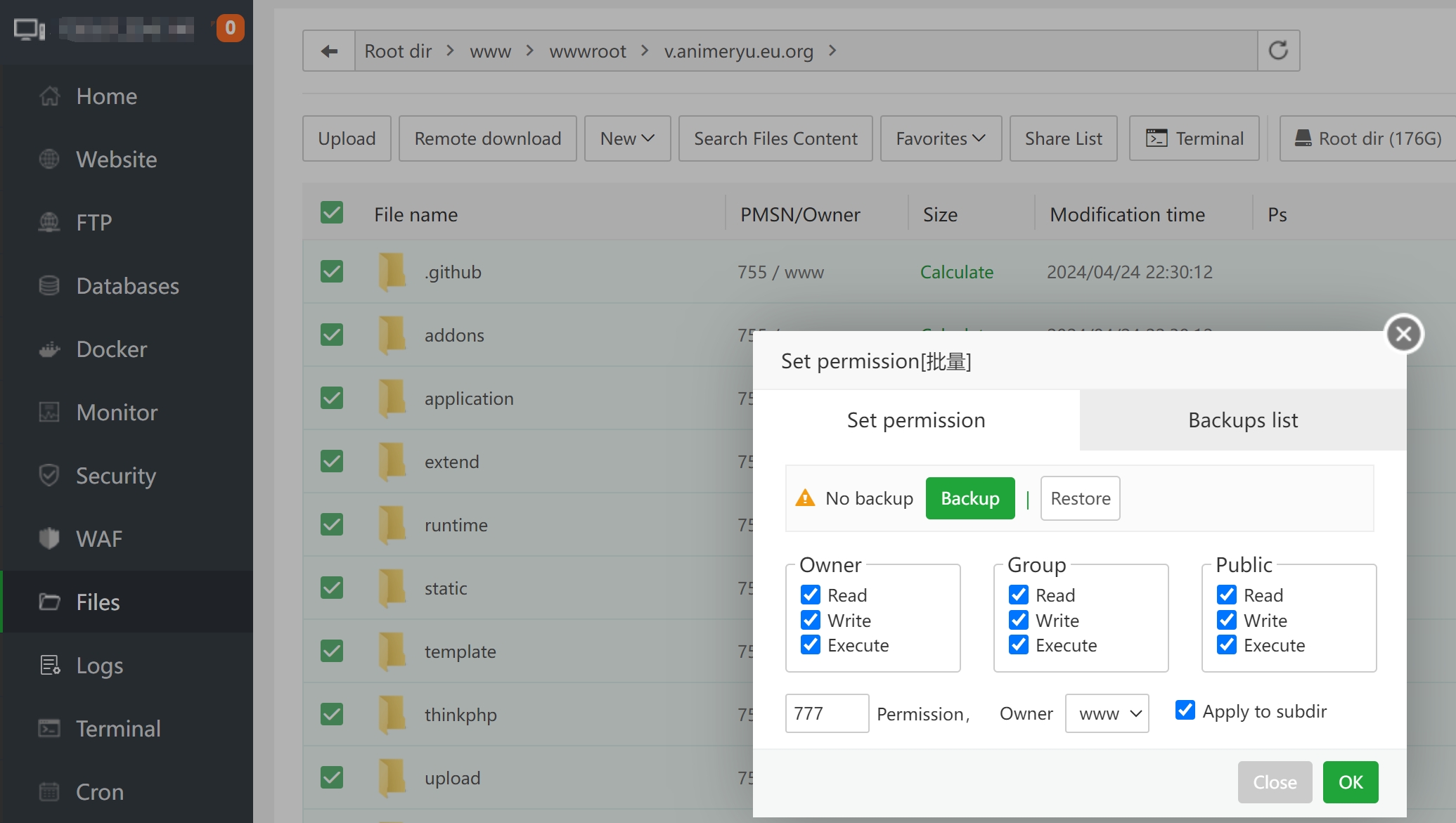 7、设置主题。通过aaPanel进入网站根目录,将电影先生2.0主题上传至在template文件夹,解压并赋予777权限。复制/template/DYXS2/asset/admin路径下Dyxs2.php文件到/application/admin/controller中,再复制/template/DYXS2/asset/admin路径下dycms.html文件到/application/admin/view/system中