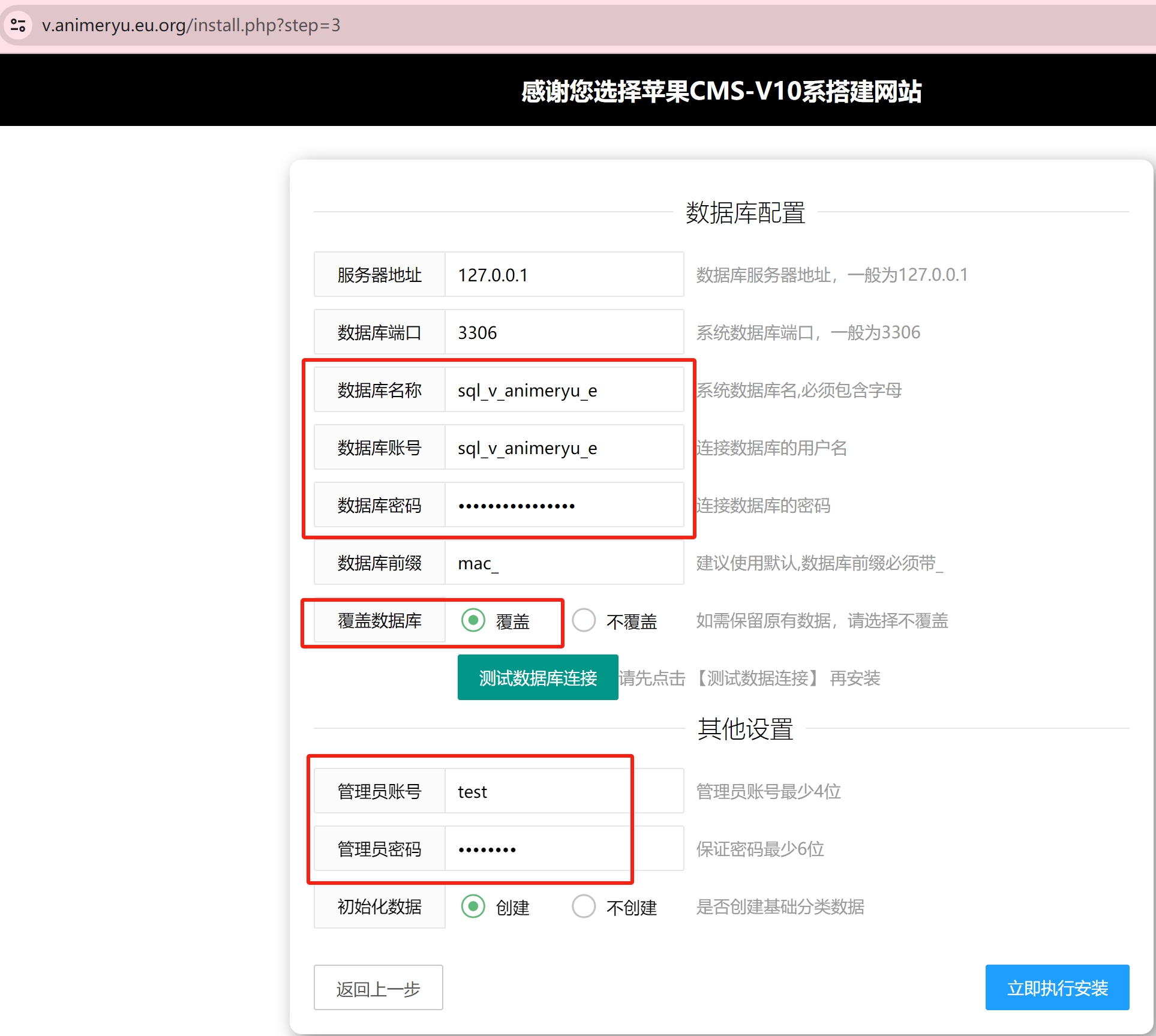 5、填写数据库名称、用户名、密码,选择覆盖数据后,点击测试数据库连接,显示连接成功即可。在设置苹果cms网站的管理员账户、密码,执行安装