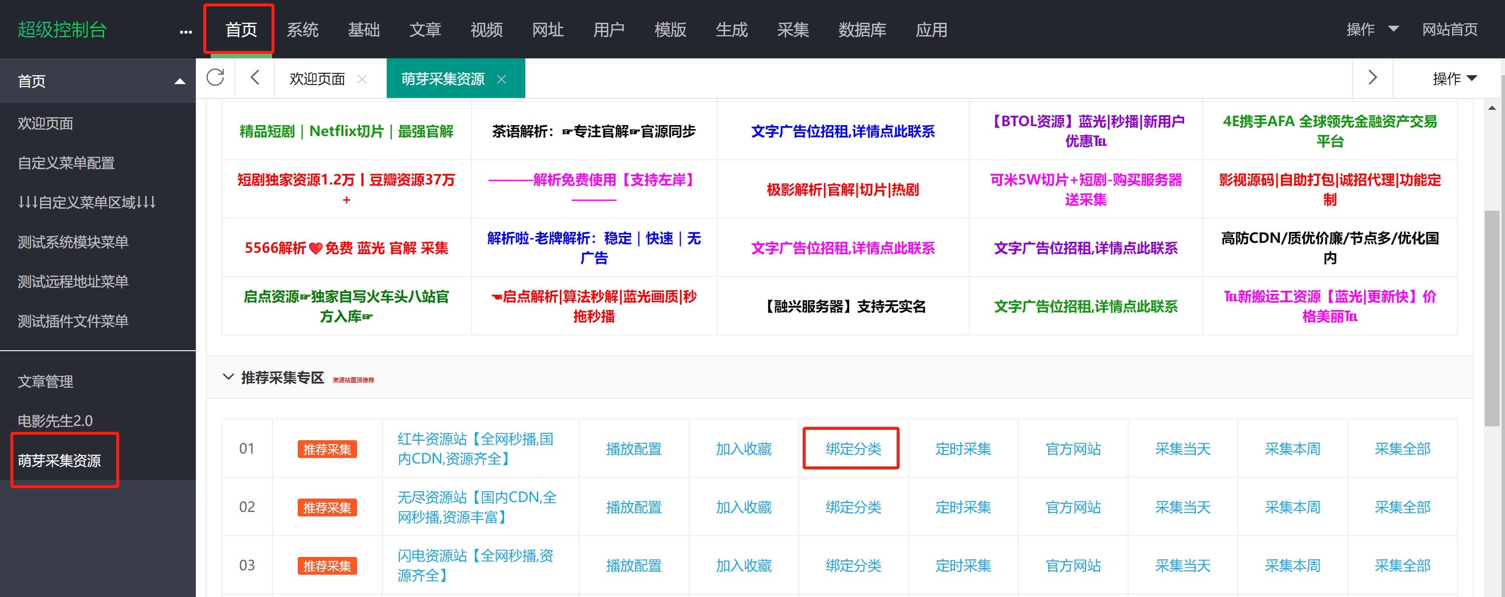 2、采集资源,点击首页——萌芽采集资源,进入采集页面,此处以红牛资源站为例。