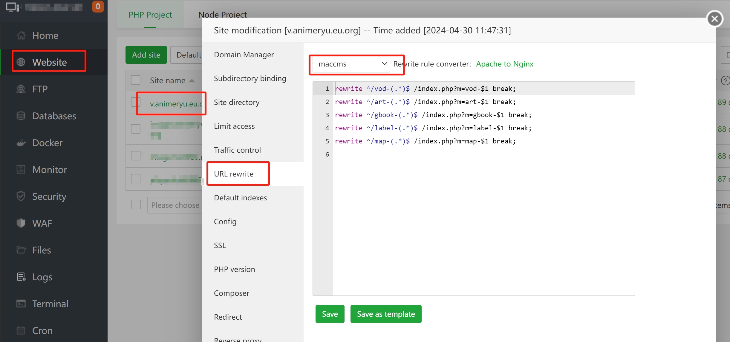 通过aaPanel进入网站设置页面,选择URL rewrite——maccms保存即可。