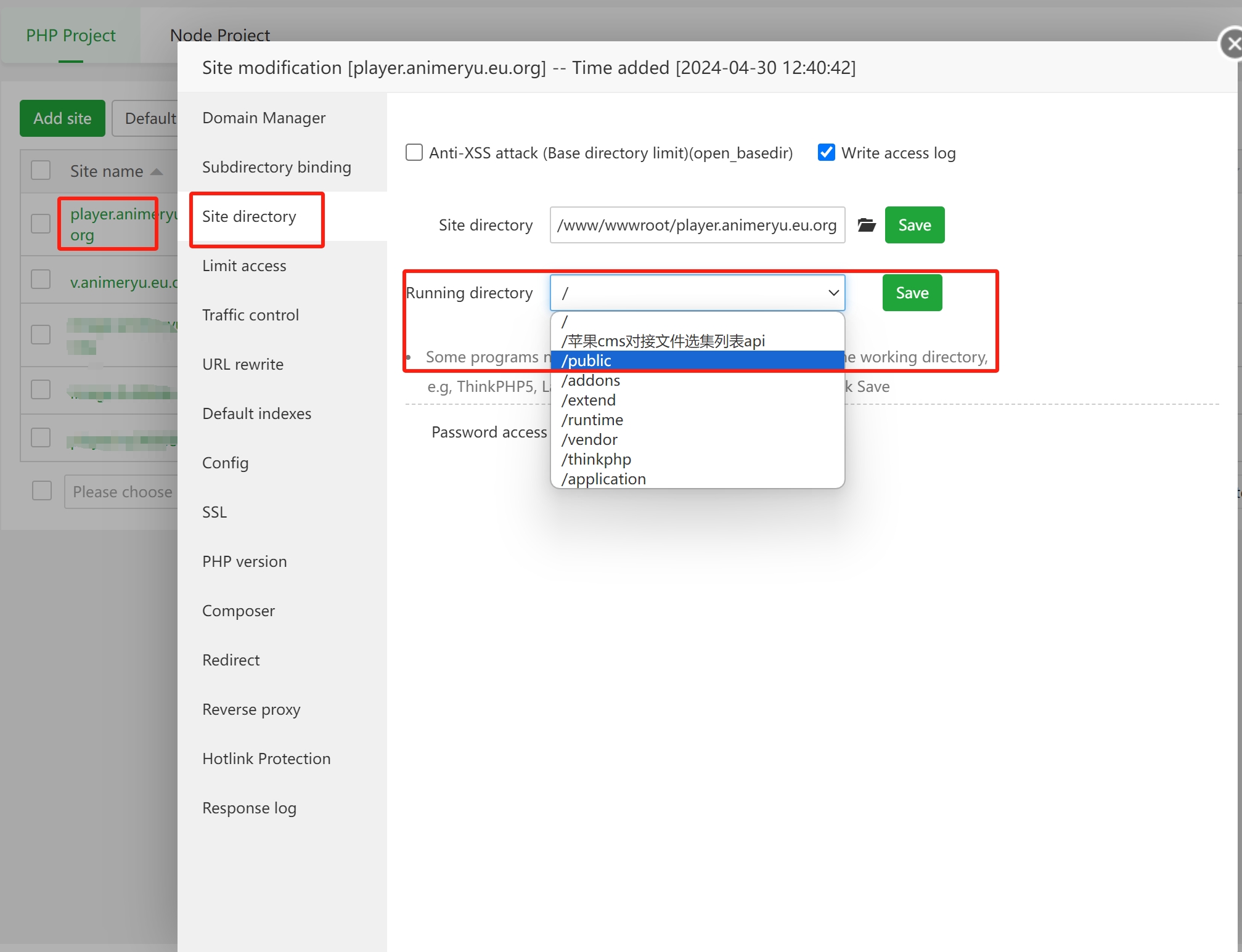 4、设置网站运行目录为public