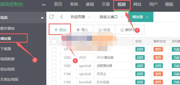 3、找到“视频”“播放器”管理,添加添加