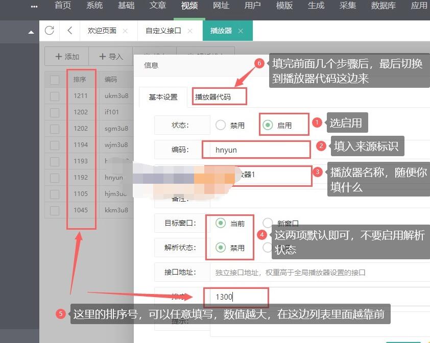 4、在弹出的窗口中,播放编码填写上面记录的来源标识,如果该采集api有多个来源标识,则添加多次,只有一个就添加一次,如果有多个,就添加多个播放器。