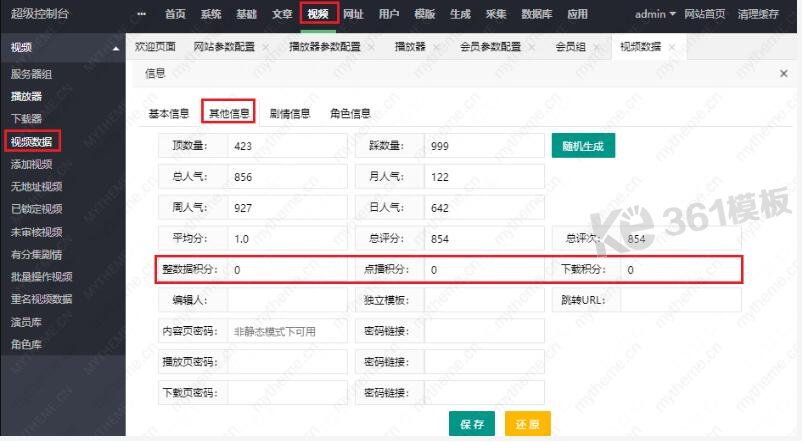 3,进入到影片的编辑后要切换到其他信息里面才可以看到点播积分相关参数。然后填写你具体要设置的积分数就可以了。