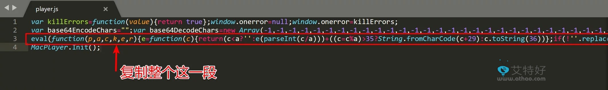 5. 将加密的代码覆盖回源player.js文件的第三行,同时需要删除第二行base64EncodeChars后面的机密密文,如下图