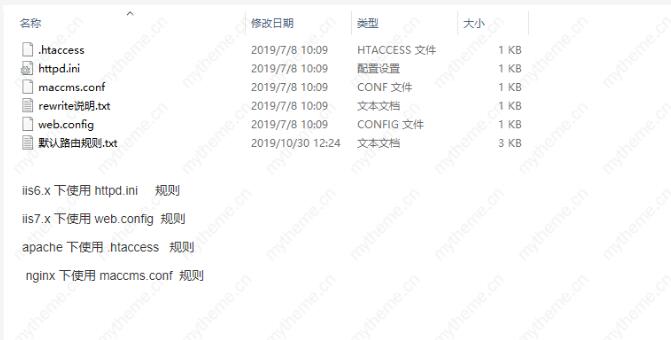 3,伪静态规则去哪里找呢?这个很多人都疏忽了,其实就在苹果cms系统安装包里自带,系统文件夹里面包含一个伪静态规则名称的文件夹,里面就是常见的几种环境的规则。