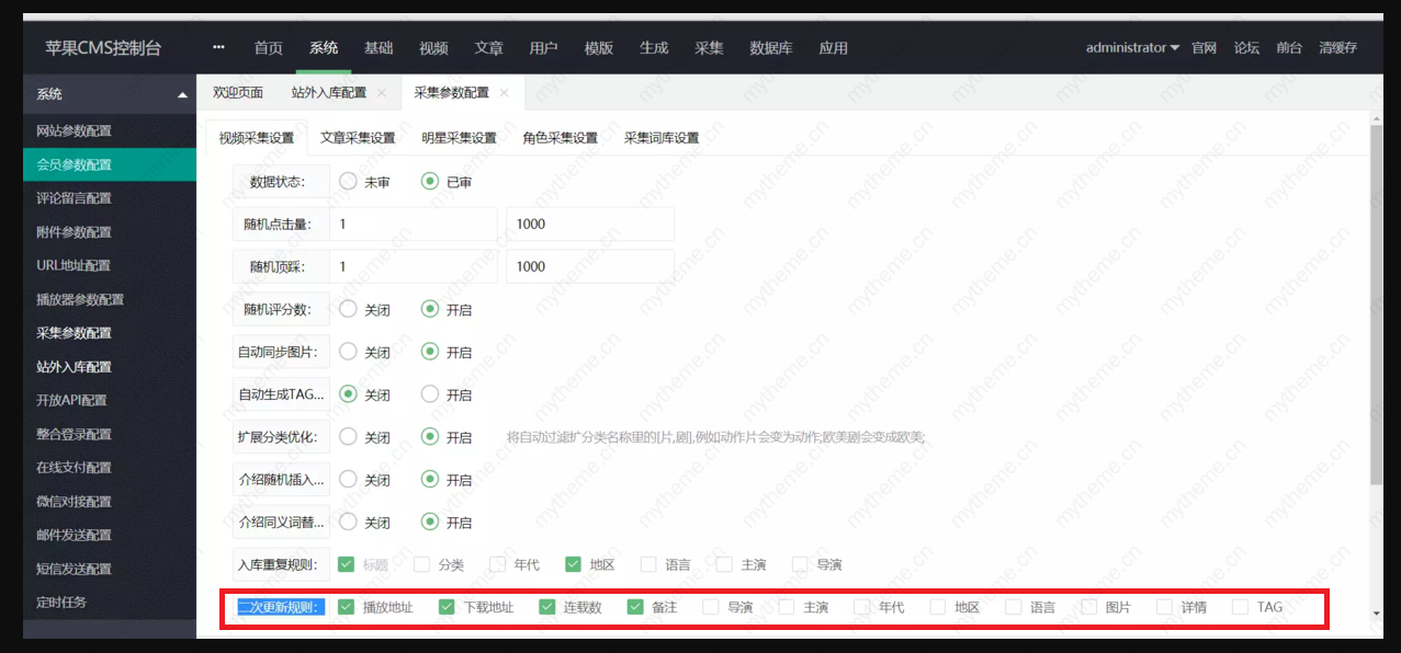 打开苹果CMS后台设置-采集参数配置,我们可以看见”二次更新规则”,里面默认值勾选了播放地址,我们只需要将“备注”条目勾选上保存即可。