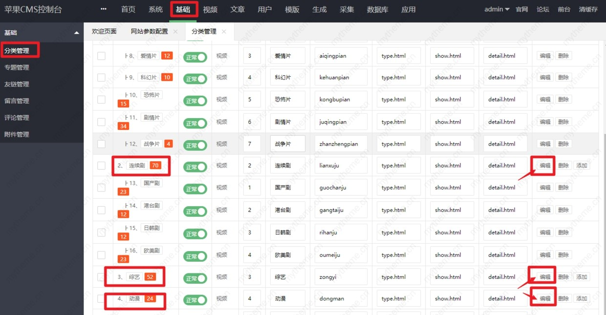 第三步:苹果CMS V10管理后台>>基础>>>分类管理>>>将【1:电影。2:电视剧。】以下的子分类,>>>SEO描述:2018改为2020保存即可。(只要看见SEO三个选项中有2018字样的,改为2020就可以了,)